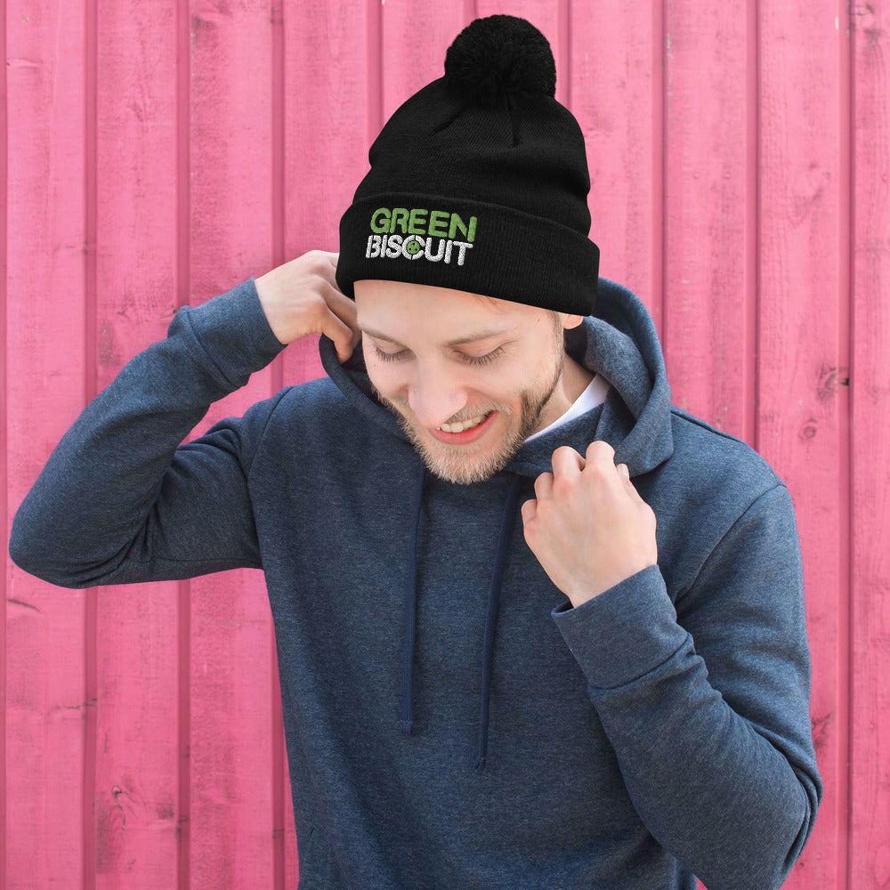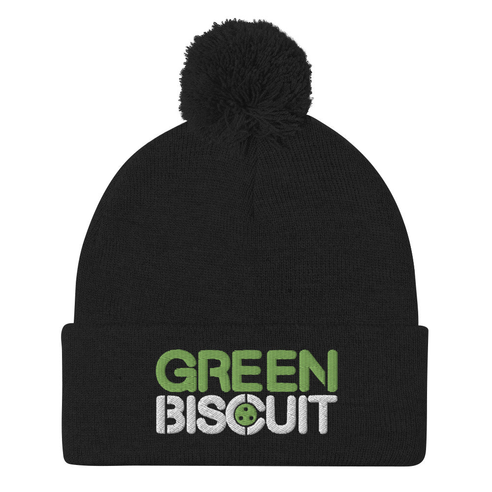 Black beanie with 'Green Biscuit' text and logo on a white background
