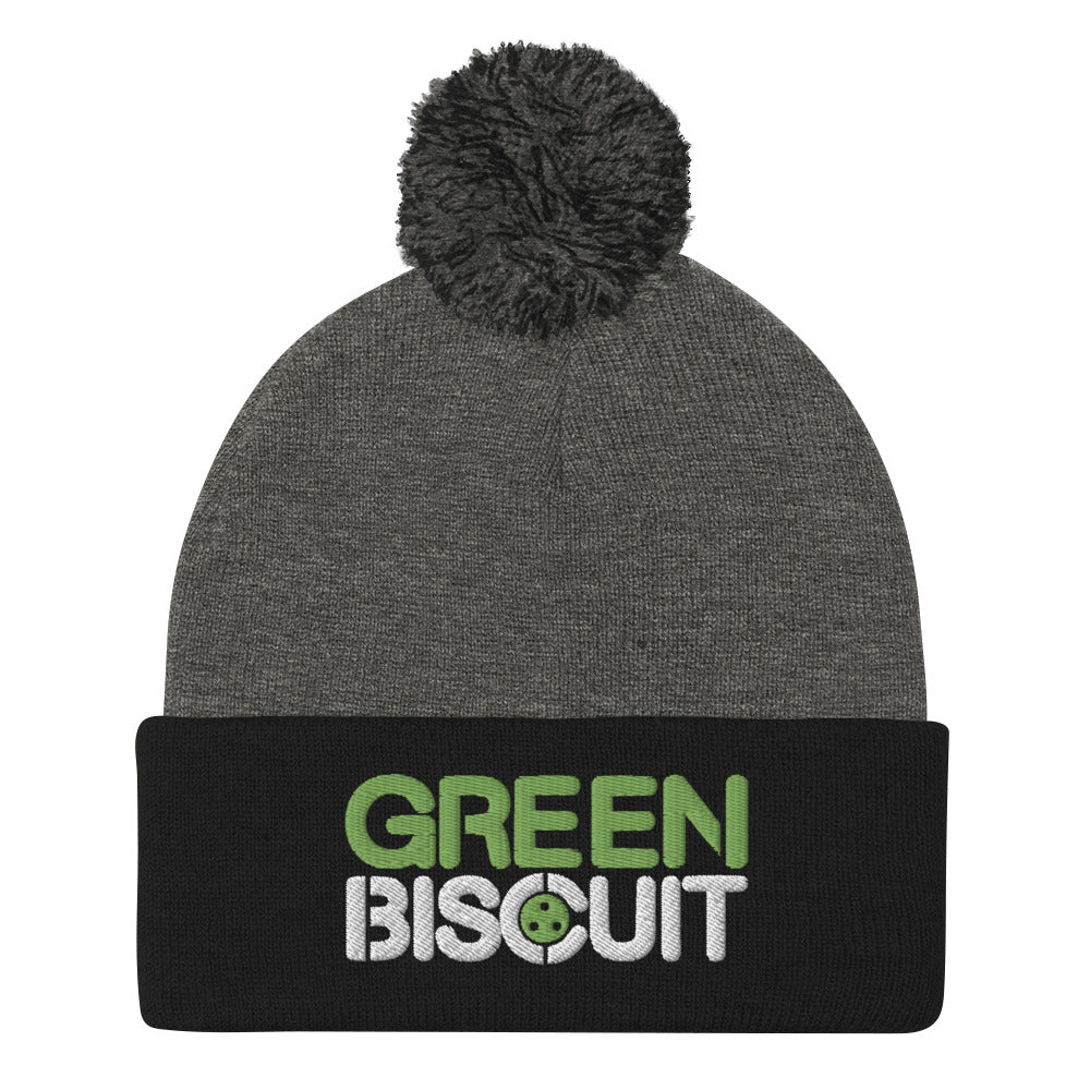 Gray beanie with black band featuring 'Green Biscuit' text on a white background